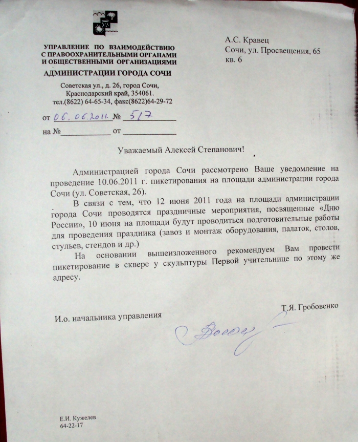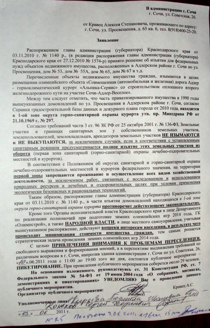 Таким образом, пока идут судебные разбирательства ОБРАЩАЮ ВНИМАНИЕ ОБЩЕСТВЕННОСТИ на то, что 10.06.2011 года c 11:00 до 19:00 напротив здания администрации г. Сочи по ул. Советская, 26, ДЛЯ ПРИВЛЕЧЕНИЯ ВНИМАНИЯ к проблемам «ПЕРЕСЕЛЕНЦЕВ» c целью свободного выражения и формирования мнений, а также в перспективе выдвижения требований по различным вопросам в г. Сочи, ПОВТОРНО пройдет публичное мероприятие — ПИКЕТИРОВАНИЕ.