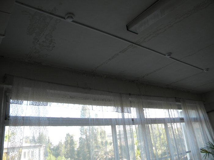потолок залит, такое ощущение будто потоп происходит каждый раз как идёт дождь! Стены в коридорах обшарпаны