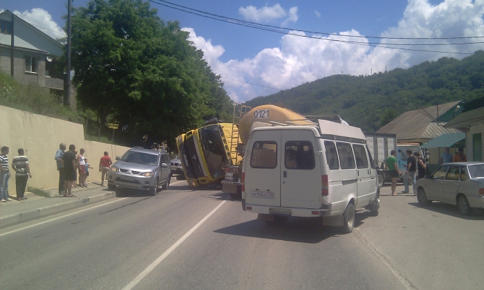 В промежутке между 12:10 и 12:40 ДТП на трассе Адлер-Красная Поляна, по предварительным данным без пострадавших, повезло что Foton упал на Iveko а не на легковушку, по слухам Foton подрезали он зацепил бордюр, вырвало мост и он перевернулся…