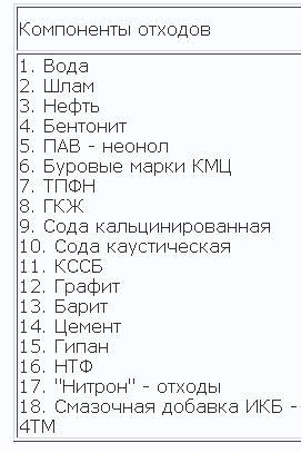 В своем составе они содержат широкий спектр загрязнителей минеральной и органической природы, представленных материалами и химреагентами, используемыми для приготовления и обработки буровых растворов (например: полиакриламидом (ПАА), конденсированной сульфитспиртовой бардой (КССБ), карбоксиметилцеллюлозной (буровые марки КМЦ), СЖК, ВЖС, dk-drill, DKS-extender, sypan, T-80) [12].