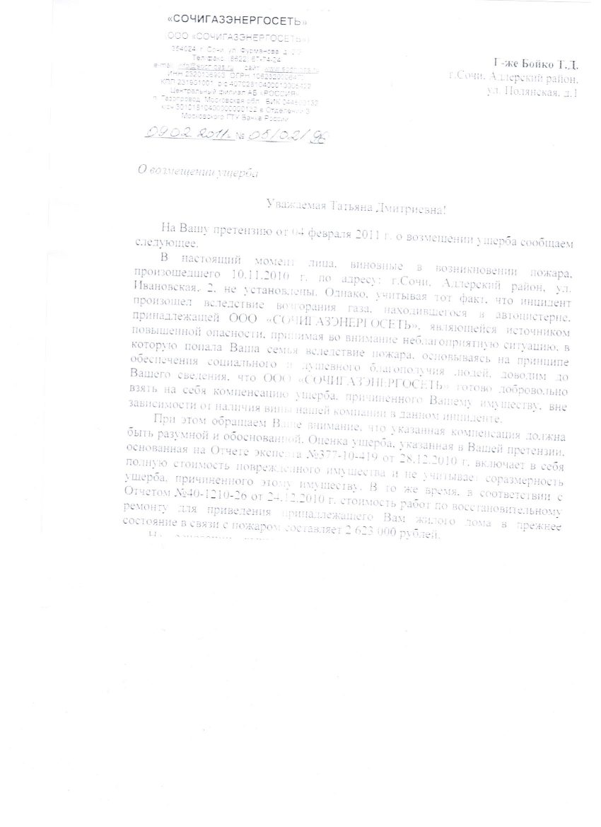 принимая во внимание неблагоприятную ситуацию, в которую попала Ваша семья вследствии пожара, основываясь на принципе обеспечения социального и душевного благополучия людей ООО Сочигазэнергосеть готово ДОБРОВОЛЬНО взять на себя компенсацию ущерба причиненного Вашему имуществу, ВНЕ ЗАВИСИМОСТИ ОТ НАЛИЧИЯ ВИНЫ НАШЕЙ КОМПАНИИ В ДАННОМ ИНЦИДЕНТЕ.