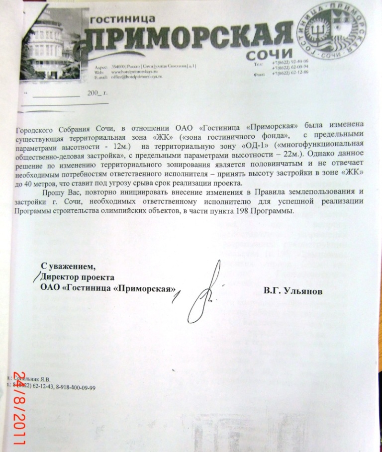 13 апреля 2011г. Комиссией по ПЗЗ были проведены публичные слушания по вопросу о предоставлении разрешения на отклонение предельных параметров разрешенного строительства объекта – четырехзвездочная гостиница «Приморская» на 350 номеров и 10 апартаментов в составе санаторно-курортного комплекса «Приморский» в Центральном районе (проектные и изыскательские работы, реконструкция и строительство) в части увеличения максимальной высоты здания до конька крыши 40, 5 метров вместо максимальной высоты по ПЗЗ для территориальной зоны ЖК (гостиничного фонда)-12.0м.; зоны ОД-1 (многофункциональная общественно-деловая застройка) — 22.0м.; зоны Р2 (зеленые насаждения общего пользования) не подлежащей застройке.