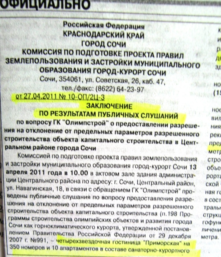 Заключение Комиссии от 27 апреля 2011г. № 10-ОП/2Ц-3 было опубликовано 4 мая 2011г. в газете «Новости Сочи» за №70 (1557), то есть вступило в законную силу.