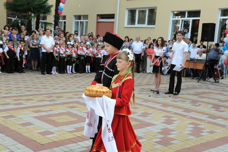 Школьная линейка началась с приветствия ведущих (старшеклассницы) и поднятия флага РФ… следом за ним на площадь перед школой внесли флаг Краснодарского края…