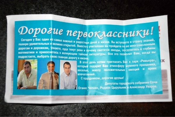 в конверте с наклеенным поздравлением для первоклассника (там же и портреты трёх депутатов) обнаружился билет…