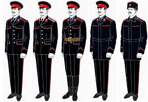 Кубанское — верх папахи — алый, Мундир (чекмень) — темно-синий, Брюки (шаровары)- темно-синий, Лампасы (канты) — алые. Расцветка погон — алый