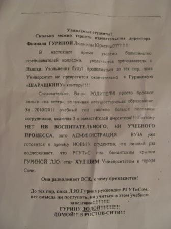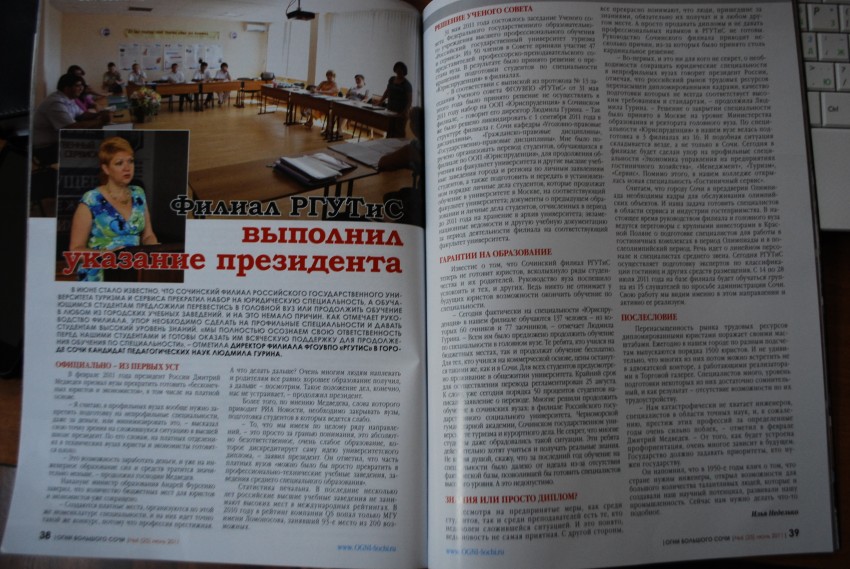 Более чем интересная ситуация складывается в последние месяцы в сочинском филиале РГУТиС. В июне директор филиала Людмила Юрьевна Гурина объявила о закрытии специальности «юриспруденция», ссылаясь на призыв президента России Дмитрия Анатольевича Медведева прекратить ВУЗам готовить бесконечных юристов и экономистов.