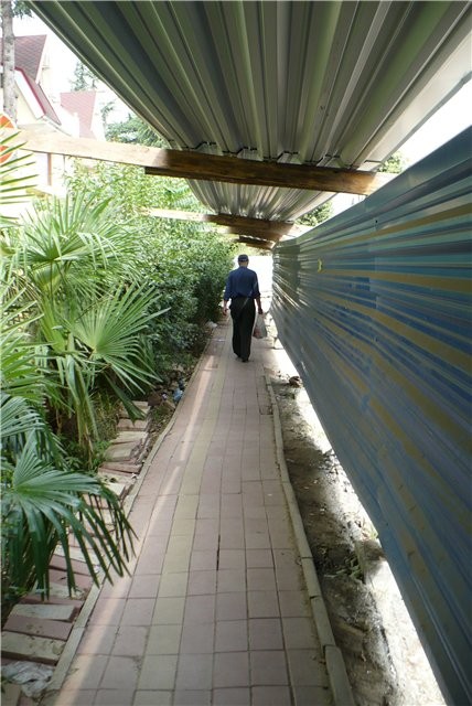 Кое-где вместо тротуарной плитки проложены деревянные мостки, кое-где путь проложен в обход тротуара.