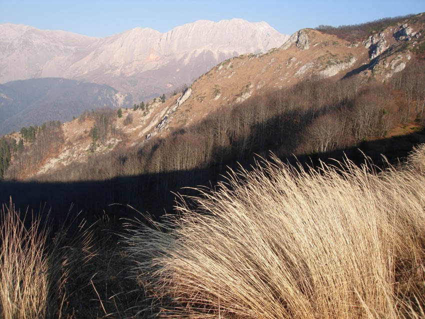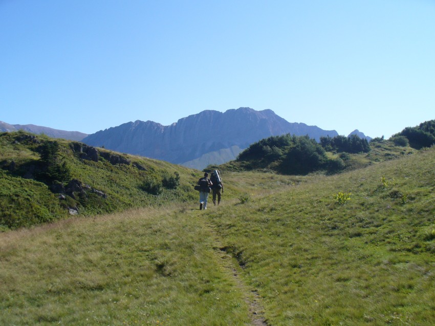 Согревшись утренними лучами стали собираться обратно. В 9:00 вышли. По дороге нашли куст черники, до чего же она вкусная! У столба нужно было поворачивать вправо, но видимо засмотревшись на скалистый массив мы опять пошли не туда. А именно на перевал Черкесский. Через два часа пути чуть ниже увидели хорошо набитую тропу, по которой и возврашаются с Фишта. Позже нам сказали, что до перевала мы недошли самую малость. К развилке мы спустились к часу дня. И нам опять повезло с машиной. И уже в 16:20 мы были в Дагомысе.