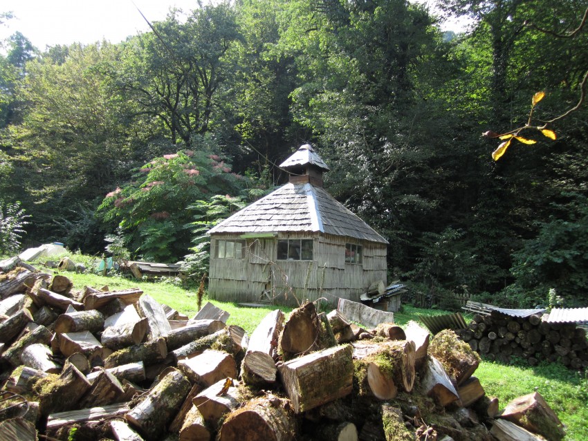 Примерно через 10 км от Солох-Аула выходим к реке. На поляне активно ведется строительство довольно большого здания. Как оказалось сфотографировать его я забыл. Тут надо было переходить реку, но мы, не зная дороги, решили продолжать идти по правому берегу реки. Через полтора километра забрели в этот сказочный лес