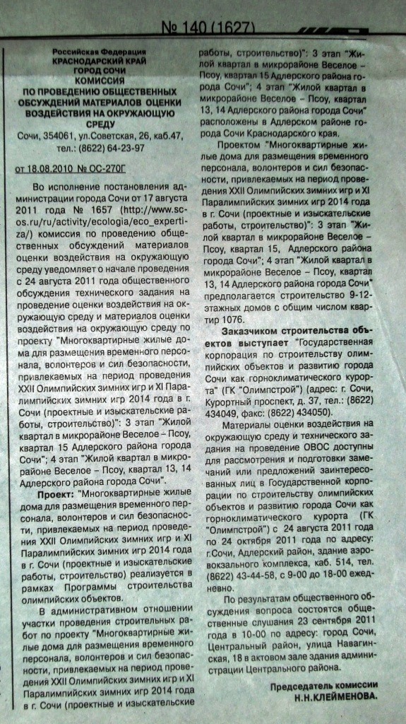 12 октября 2011 года (постановление администрации города Сочи от 01.09.2011 № 1781) — проведение общественных обсуждений (в форме слушаний) материалов проектной документации (включая материалы оценки воздействия на окружающую среду) по объекту «Многоквартирные жилые дома для размещения временного персонала, волонтеров и сил безопасности, привлекаемых на период проведения XXIIОлимпийских зимних игр XIПаралимпийских зимних игр 2014 года в г. Сочи (проектные и изыскательскиеработы, строительство)» п. 207.1 Программы строительства олимпийских объектов: 1 этап «Жилой квартал по улице Тепличной в селе Раздольное Хостинского района города Сочи»; 2 этап «Жилой квартал в селе Веселое Адлерского района города Сочи по ул. Таврическая – Акаций»; 5 этап «Жилой квартал в селе Веселое Адлерского района города Сочи по ул. Таврическая – Урожайная»; 6 этап «Жилой квартал по ул. Ачишховская, поселок Красная Поляна Адлерского района города Сочи»; 7 этап «Жилой квартал по ул. Защитников Кавказа, поселок Эсто-Садок Адлерского района города Сочи»