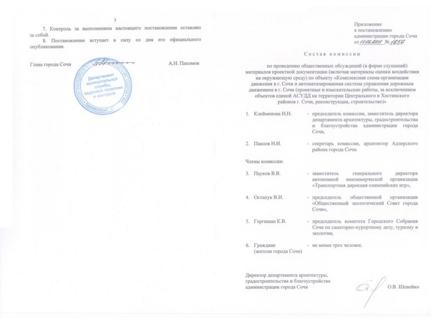23 сентября 2011 года (постановление администрации города Сочи от 17.08.2011 № 1656) — проведение общественных обсуждений (в форме слушаний) материалов проектной документации (включая материалы оценки воздействия на окружающую среду) по объекту «Комплексная схема организации движения в г. Сочи и автоматизированная система управления дорожным движением в г. Сочи (проектные и изыскательские работы, за исключением объектов единой АСУДД на территории Центрального и Хостинского районов г. Сочи, реконструкция, строительство)».