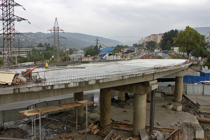 Бетонная гладь мостового перехода соединила два берега реки Сочи. На днях завершилось бетонирование и на ответвленном от улицы Донской съезде в направлении улицы Пластунской. Здесь, кажется, еще вчера медленно вырастали тела опор, а сегодня пролетные конструкции перекрыты бетонным настилом, на который со временем ляжет слой асфальта. Впрочем, до укладки асфальта дорожным строителям предстоит сделать стыковые швы между пролетами, завершить обустройство цоколя барьерного ограждения, провести гидроизоляцию.