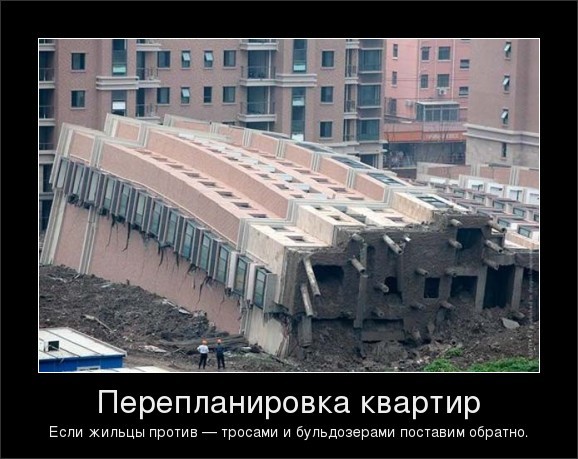 «Дом построен по монолитной технологии и не может рассыпаться. Может наклониться. Даже если он упадёт, не рассыпется. Ну, прийдётся перепланировать квартал. Ну, изменится планировка квартир. Если жильцы будут против — мы тросами и бульдозерами его поставим обратно.»