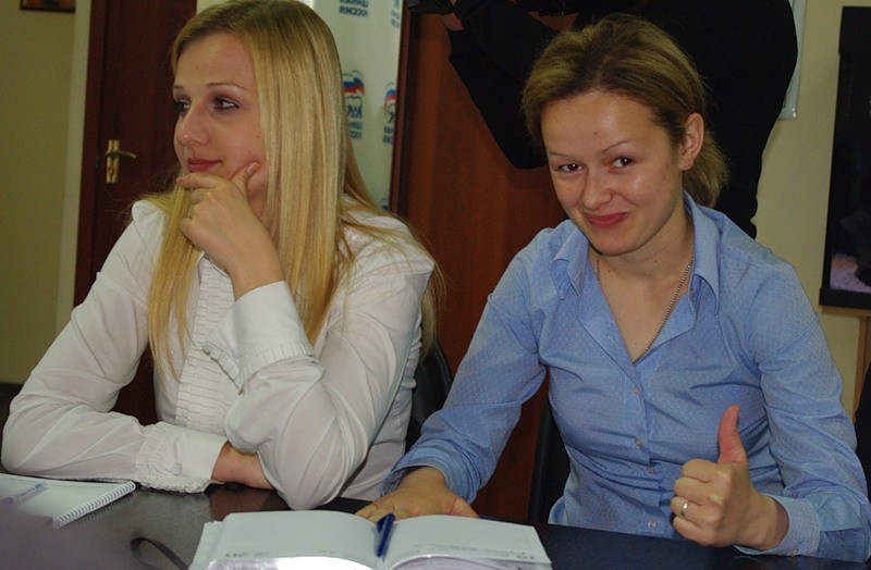 В глубине кадра поближе к президиуму (Тепляков, Селюкова).