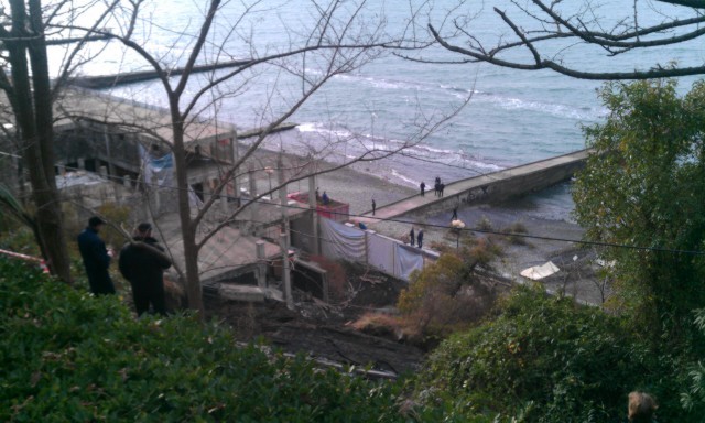 Топик прямо с дороги. Только что был свидетелем схода оползня недалеко от гост. «Приморской». Вернее, его последствий. Оползень вылез прямо на пляж под углом 45-50 градусов. Движение по набережной блокировано милицией и МЧС. На пляже работают люди с розыскными собаками. Ни фото, ни видео у меня нет. (возвращался с вечеринки) Вырвало даже деревья, что росли выше. Проход, (если идти по набережной от бывшего Мориса Тереза), заблокирован в районе ресторана «Сказка Востока».