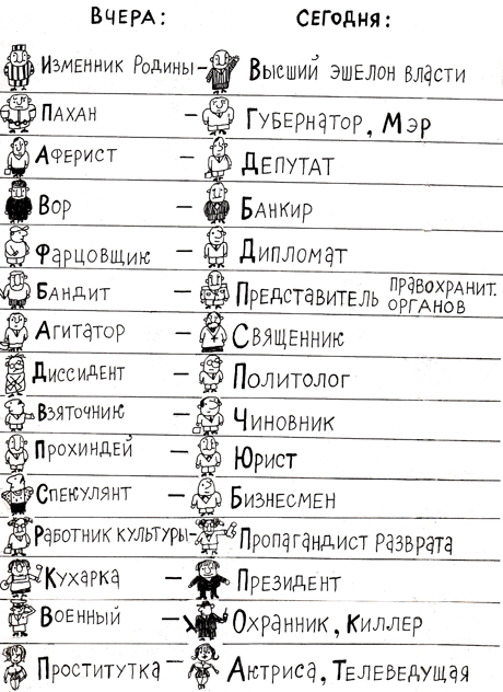 А чтобы пресечь в дальнейшем саму возможность даже подумать о том, чтобы вернуть прихваченную собственность законному владельцу, т.е. народу (понимем это как государсту), Эти нувориши начали в срочном порядке производить реформирование всех слаженных структур некогда могучего государства, подменяя общечеловеческие ценности, меняя законы, сознание людей, разделяя некогда сплочённый народ, разводя его по разные стороны барикад. «Разделяй и властвуй» — говаривал некогда один чудак древности.