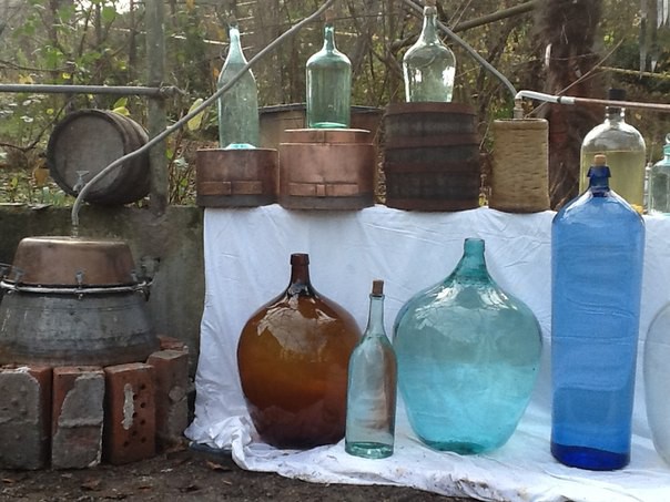 четыре ведра винограда залил ведром воды (виноград не мыть ни в коем случае, белый налет на ягодах это дрожжевые грибки)… Через три дня отжал из этой смеси сок… Добавил 5 кг сахара. Залил в молочный бидон, соорудив для оного водяной затвор, и оставил бродить. Вобщем все сделал как при изготовлении вина… По окончании бурного брожения, полученное вино перегнал… На выходе получил 5 литров виноградной водки 50% крепости.