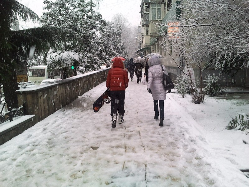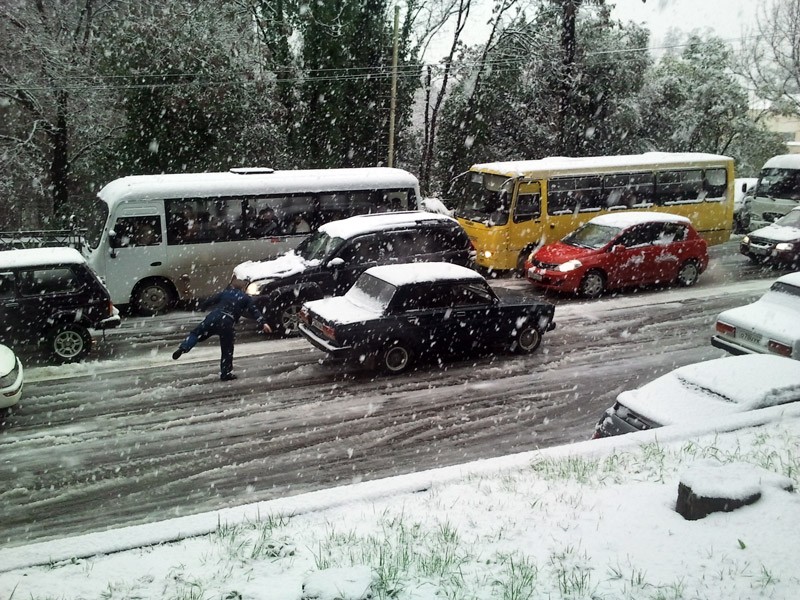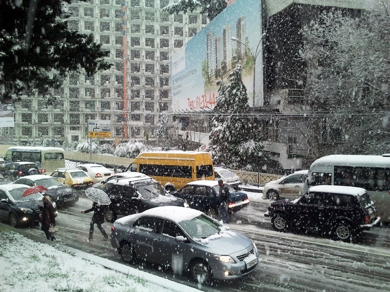 Сегодня Сочи накрыло снегопадом. Все видели. Вот кое-что ещё. На подъеме зашлифовала летней резиной дама в мерседесе, а навстречу в мэрию Пахомов с мигалками. Ну и не может аудюха А8 мэрская протиснуться. Пришлось разруливать лично.