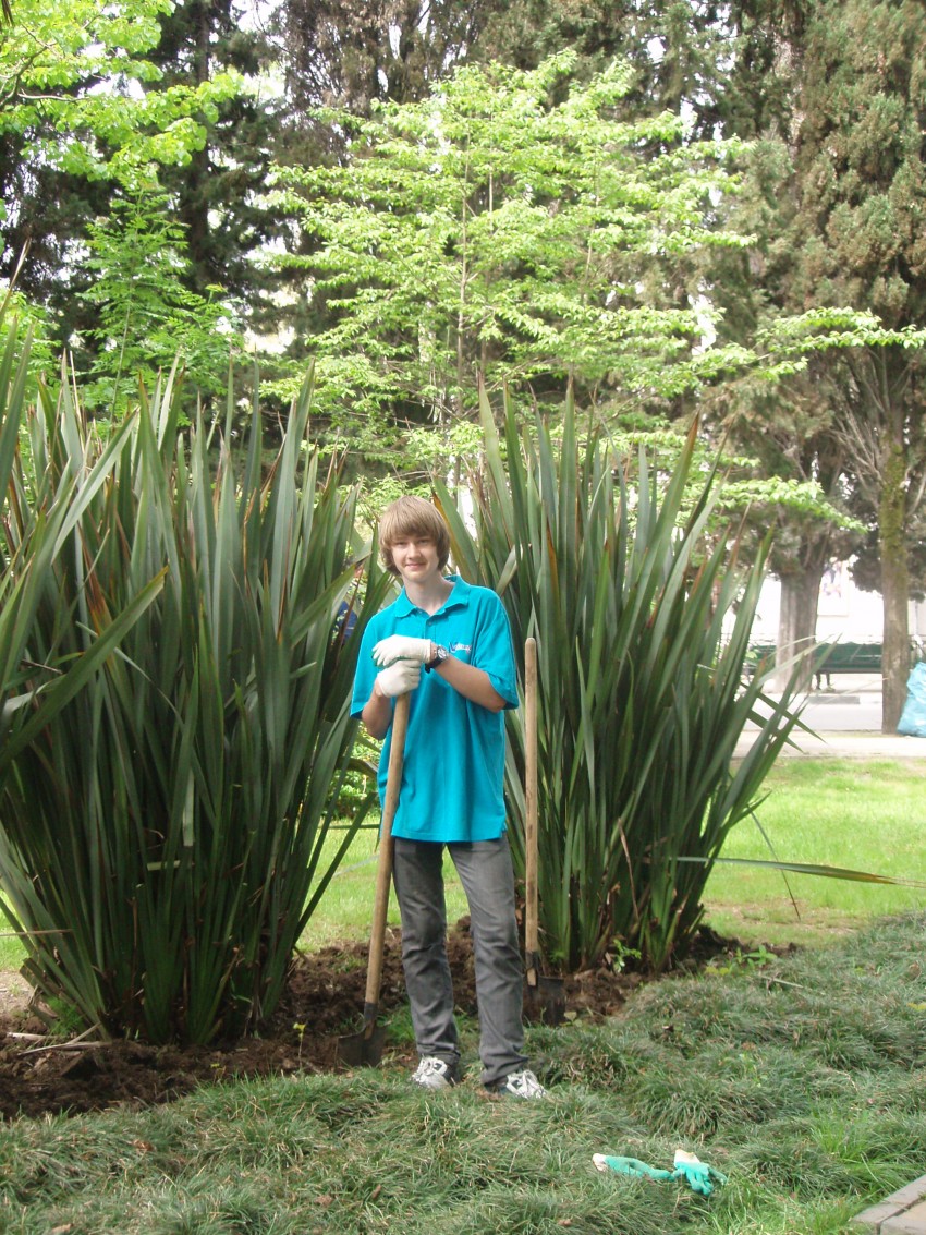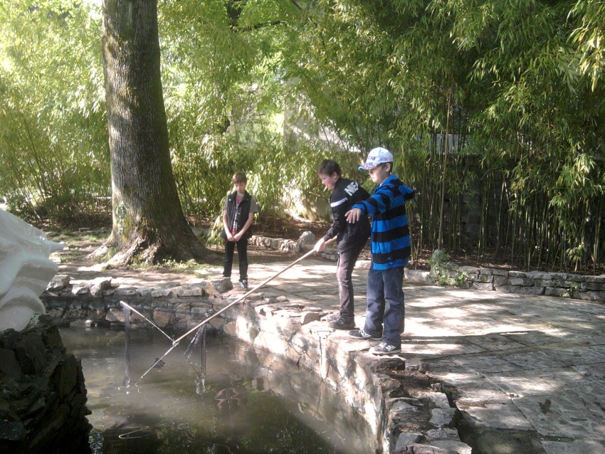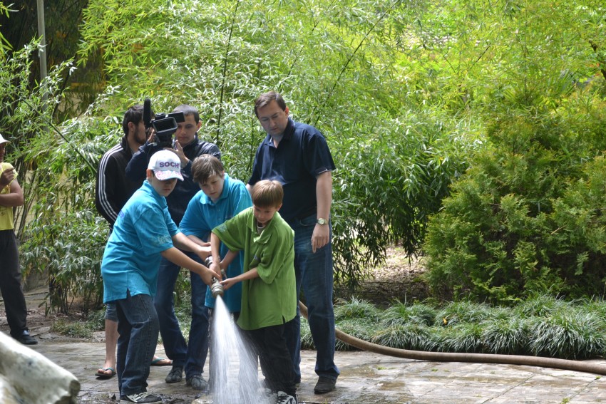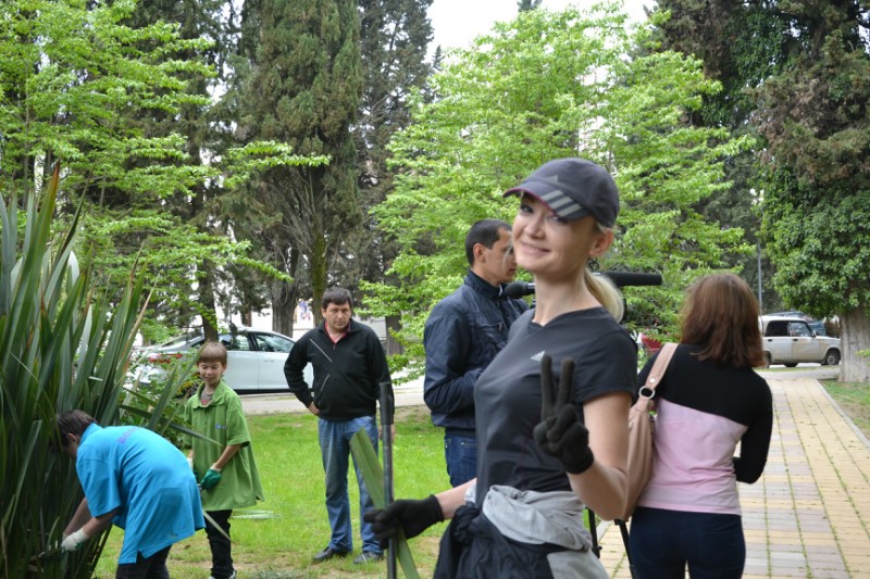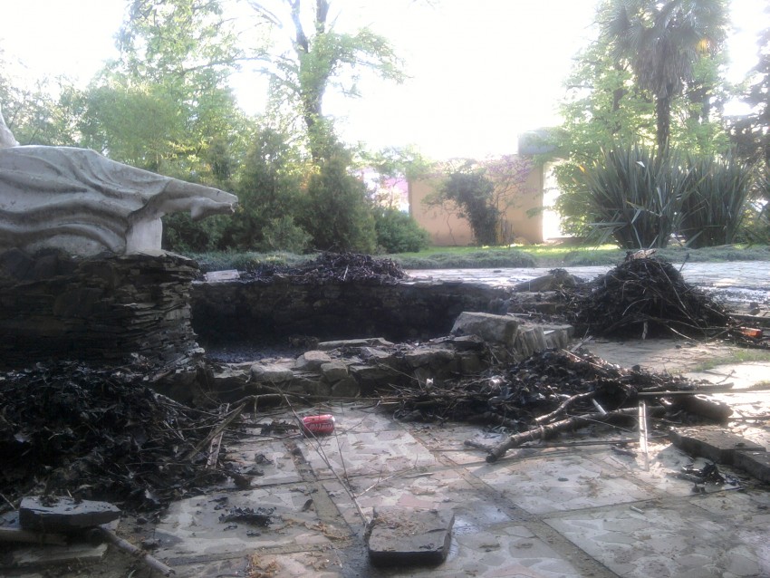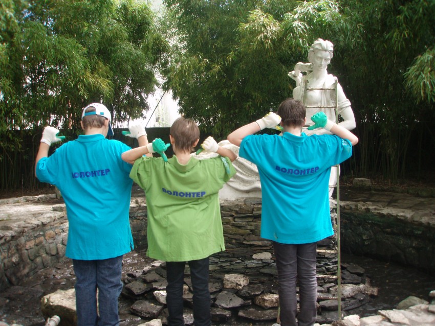Самое трудоемкое — было подготовить резервуар вокруг скульптурной композиции. За зиму на дне скопилось большое количество листвы, веток и желудей со старого дуба, а также результат пребывания «человека». Эту самую тяжелую работу взяла на себя администрация Хостинского района и подрядная организация, представители, которых приняли личное участие в акции, а также предоставили инвентарь и автотранспорт для вывоза собранного мусора.