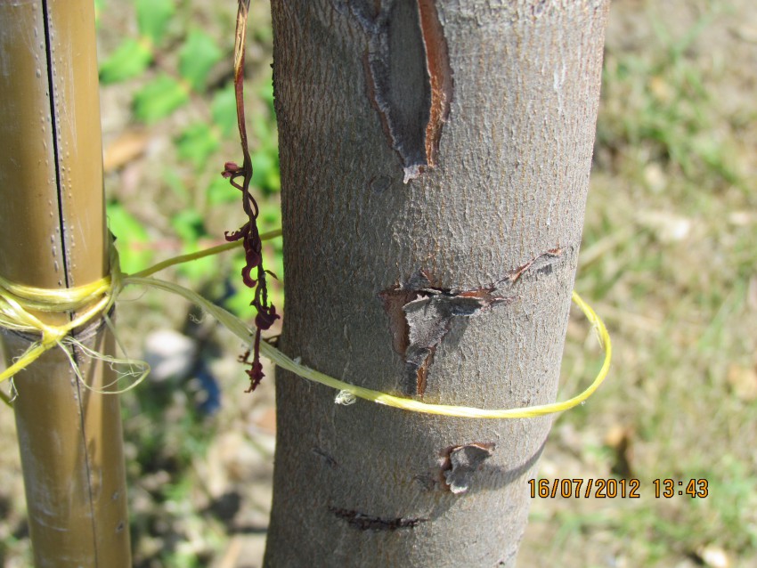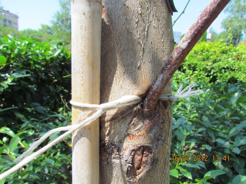 Сначала их просто воткнули в землю, бабушка подошла и объяснила рабочим, что нужно ставить распорки, иначе от ветра, корневая система повредится и дерево пропадёт… Поставили распорки, подвязав синтетической бечевой, что делать КАТЕГОРИЧЕСКИ нельзя, потому что дерево растёт, а бечева въедается в ствол, что, собственно, и произошло…