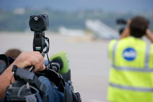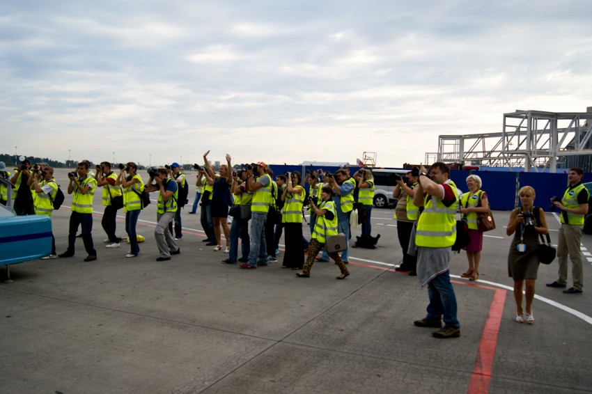 Нас даже на борт пустили. Забавно было… Самолёты, насколько я понимаю, как правило, прилетают, проходят все стандартные процедуры типа уборки, заправки, разгрузки багажа и тут же принимают пассажиров, летящих в обратном направлении. Нам нужно было успеть забежать на борт и пощёлкать как раз в промежутке времени, пока одни борт покинули, а других ещё не подвезли. Поэтому первых упомянутых мы встречали у трапа. С трудом представляю, что думали обычные люди, выходящие из самолёта и видящие перед собой 50 человек в зелёных манишках с камерами наперевес. Некоторые выглядели откровенно удивлённо, некоторые не растерялись и успешно позировали, входя в роль того, кого действительно могла встречать такая толпа папарацци.
