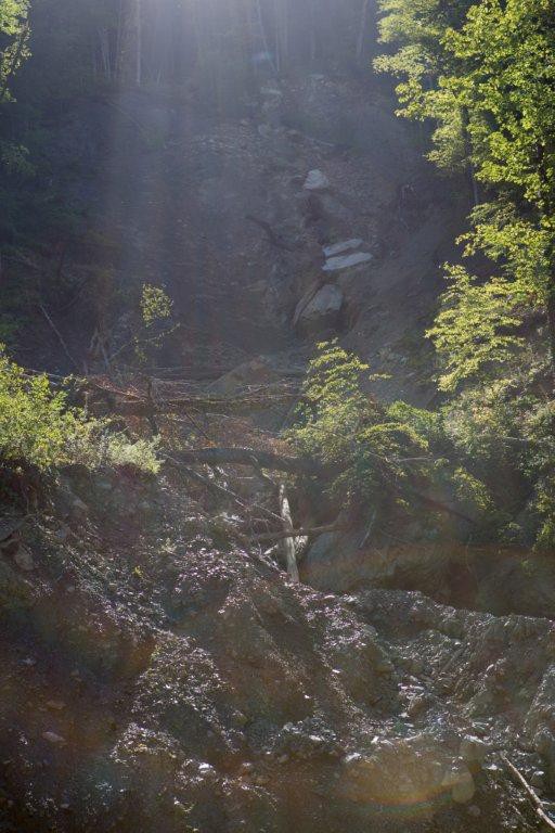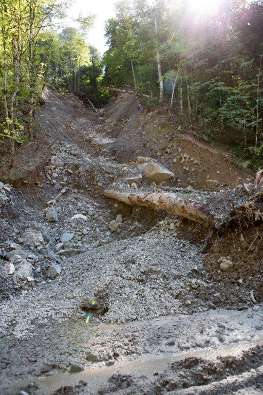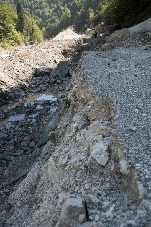 Не хочу ни на кого наговаривать, но… что-то мне подсказывает, что строители Розы Хутор «ни разу не при делах»!!! Там всегда были сели (небольшие по объему сходы грунта на дорогу). Несколько лет не был в тех местах (принципиально не хочется смотреть на этот бардак), но на предыдущих выходных решил съездить на Нарзан посмотреть что да как — был остановлен охранником на шлагбауме в 500 м от канатки Р.Х. На фото видно, что от дороги вообще ничего не осталось (надеюсь я ошибаюсь).