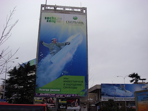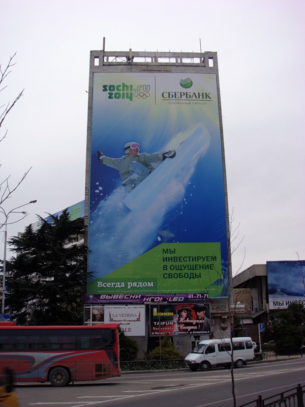 «Сегодня 02 января 2010 года в Сочи очередной шквальный ветер. Силу напора и определенный страх за свою безопасность прохожие сегодня ощутили полвосьмого вечера напротив входа в гостиницу «Москва». Огромный рекламный холст, размещенный во всю высоту здания, рвало и мотало. Были моменты, когда это полотнище весом в десятки килограммов и длиной в два-три десятка метров натянуло перпендикулярно фасаду. Парусину удерживало на одном креплении, било об окна.»