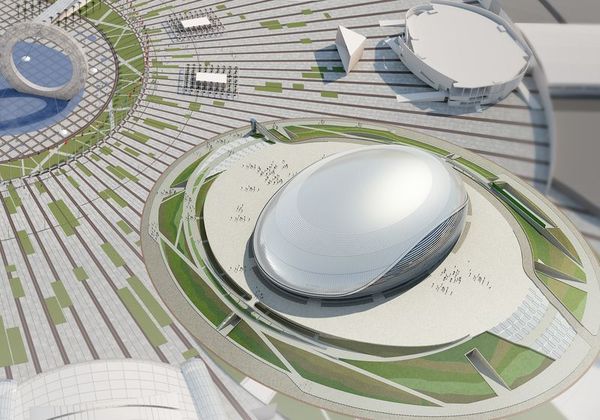 Архитекторами, инженерами, технологами НПО «Мостовик» предложен современный выразительный объем, абстрактно напоминающий и приоткрытую жемчужную раковину, и застывшую каплю росы. Такое образное решение органично вписывается в окружающий ландшафт и позволяет зданию выполнять как функции спортивного сооружения, так и функции концертного зала.