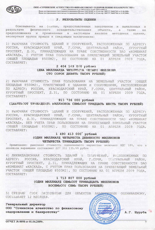 «Официальная (недавняя)оценка этого проекта проводилась для Сбербанка РФ для договора залога.Результат оценки — 2,4 млрд.руб.Сегодня Сбербанк готов выделить кредит в размере 1,2 млрд.руб.Комплекс апартаментов располагается в Центральном районе г. Сочи и имеет в своем окружении качественную красивую застройку: Здание Морпорта, Храм Михаила Архангела, здание Сбербанка РФ.Участок располагается на территории существующего комплекса ресторана „Каскад“ на расстоянии около 200 м от моря. Въезд на участок осуществляется со стороны ул.Орджоникидзе.Участок благоприятен для создания комплекса апартаментов и многофункционального общественного центра по своему месторасположению в центре города и с прекрасными видовыми характеристикам.