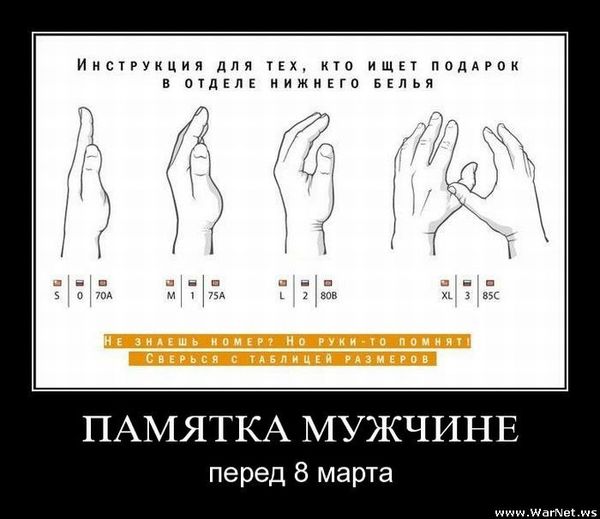 Сейчас все более-менее спокойно. Боремся мы в этот день только за запись в салон красоты. Для русского мужика что ни день, то праздник – хоть взятие Бастилии, хоть День Рогатого Бога Британии и в подсознании мужчины Женский день часто ассоциируется с испытанием воли, нервов и кошелька. А мы хотим только одного – почувствовать себя женщиной — красивой, нежной, весенней. И вот рецепт вам, мужчины – поцелуй, кофе в постель (примитивно, но действует!), цветы, духи, что-нибудь ооочень красивое (можно на пальчик и с блестящим камушком), ну и посуду помыть,… а если не хотите – ведите в ресторан. И много-много-много изощренных комплиментов!