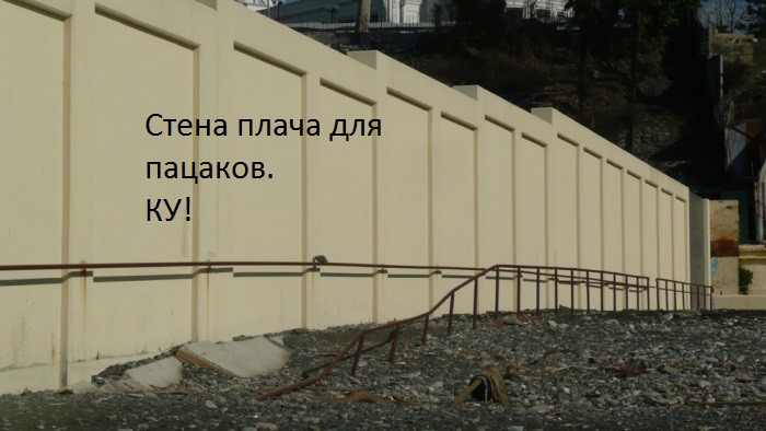 Летом 2009, в разгар пляжного сезона вдоль этой стены стояли военные с автоматами, милиция с дубинками, пистолетами и биноклями, в море у берега курсировал катер и отгонял заплывавших за стену отдыхающих. Все это мне напомнило какое-то гетто, в котором как оказалось все мы россияне живем. Неужели это правильно и так должно быть?