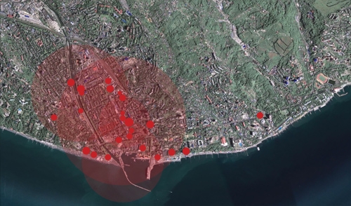 1. Среднее количество просмотров в день >400 2. Охватил одним фотоальбомом Центр Сочи и, как обещал, чуть-чуть Адлерского района. На картинке сверху — красными кружками отсмеченны места фотографирования(радиус зависел от дальности, котрыю охватил снимок), прозрачными кругами — зону, которую охватили панорманые снимки (с Александрии, ул. Первомайской). Завтра будут еще два снимка, потом — небольшая пауза. После нее — Хоста и еще Адлер.