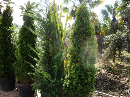 Посадили три Бутии. Цена одной такой в питомнике — более 20000 рублей! Стоит отметить, что это одна из самых дорогих(если не самая) пальм в сочинских питомниках. У них очень приятный аромат во время плодоношения. Так же посадили хвойные, подозрительно напоминающие кедр. Это радует.
