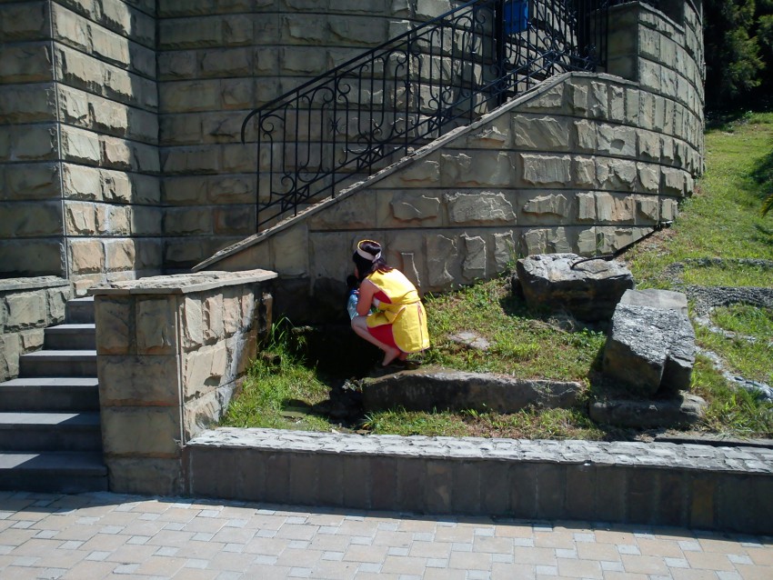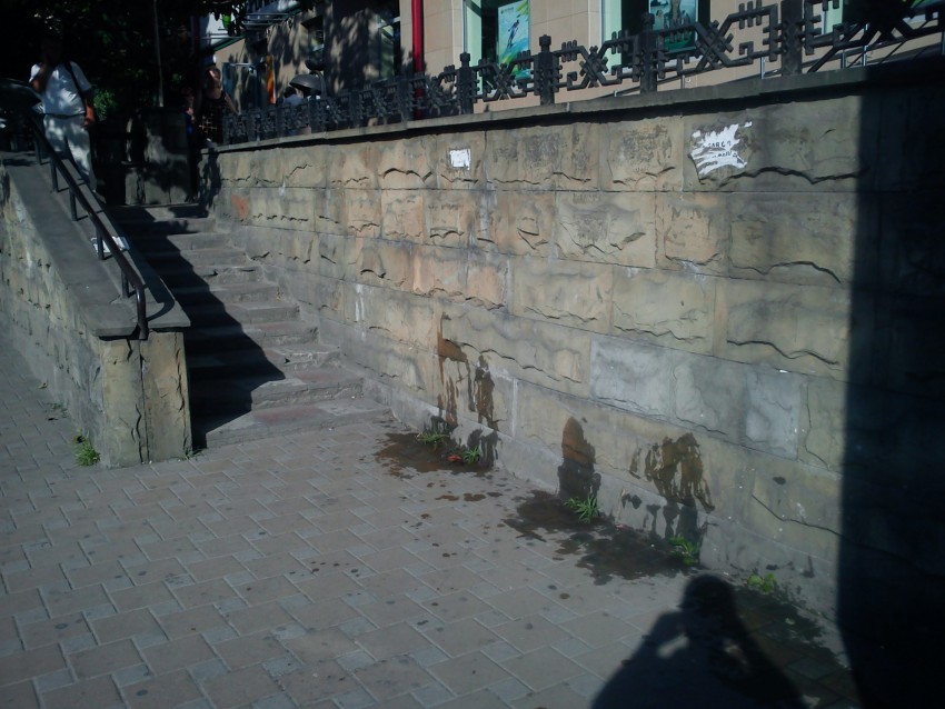 Использование дренажной воды работником точки по реализации Кваса, наверное она её руки моет. Фотография сделана на остановке автобусов «Гост. „Москва“ по ул. Горького.