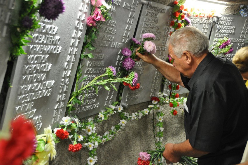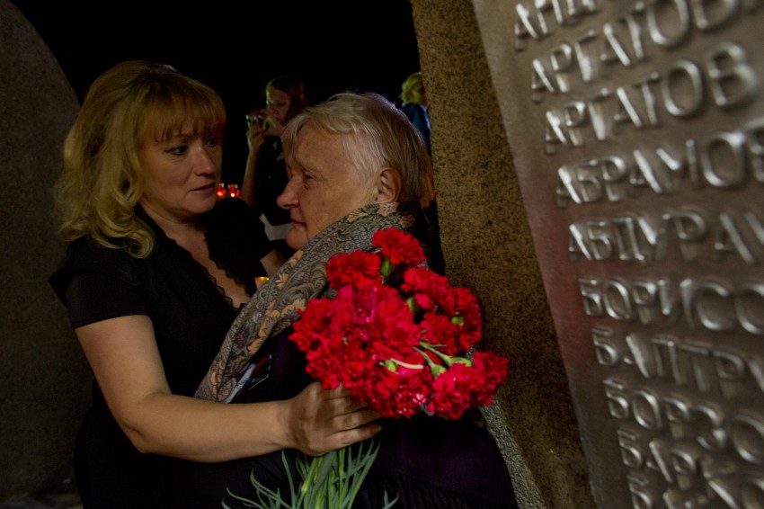 По заведенной многолетней традиции фонд «Нахимовец» первым направляется к памятнику возложить цветы – родственники погибших справедливо являются главными лицами на митинге. Гвоздики крепятся к фамилиям родных. Имена на чугунных плитах ласково гладятся ладонью, как гладит по голове мать по голове своего ребёнка.