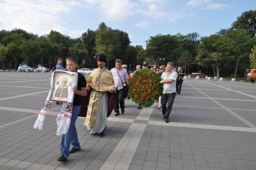С утра солнечно. По пути в порт, автобус делает остановку на рынке, чтобы участники купили цветы. Около часа ждём консула Украины. Наконец, нахимовцы выстраиваются парами, создавая колонну, и движутся в сторону причала. Во главе колоны мальчишка несёт икону. Рядом с ним, как и положено, батюшка. Следом дюжие водители с огромным венком. И остальные.