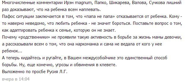 а эти вопросы очень важны для понимания кто есть кто в данной ситуации… Всё остальное — только разговоры. нужны факты, а не эмоции. Я не за тех и не за этих, я за ребёнка. Пока не было никаких документов, я просто читала, не комментируя, поэтому меня никто и не вводил в заблуждение. Как только кто-нибудь даст ответы на поставленные мною вопросы, тогда можно будет уже и делать какие-то выводы…
