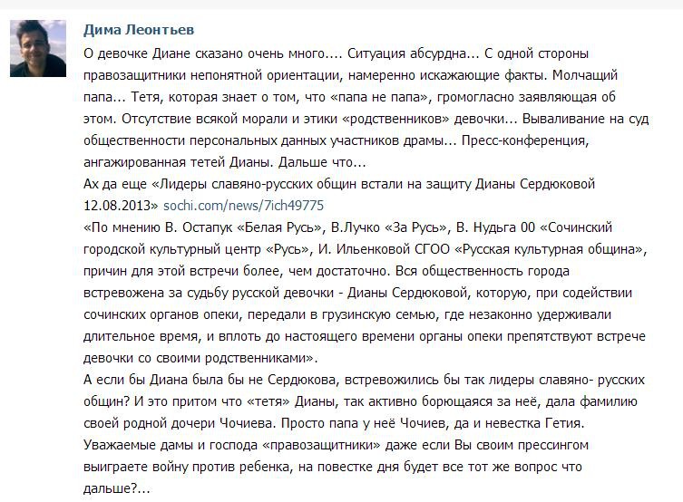 По сей день в Сочи продолжают обсуждать судьбу маленькой Дианы Сердюковой, оставшейся по воле судьбы без тепла родительской ласки. За право обладать ребенком развернута настоящая война, в которой каждая из противоборствующих сторон считает себя правой и не церемонится в выборе средств для достижения цели. В ход брошены все силы для настроя общественного мнения, с этим делом связывают уголовное преследование журналистов, в сеть вылиты тонны компромата и личных данных, свет увидели сотни публикаций и десятки телевизионных передач. Каждая из сторон пытается убедить нас в своей бескорыстной любви к ребенку.