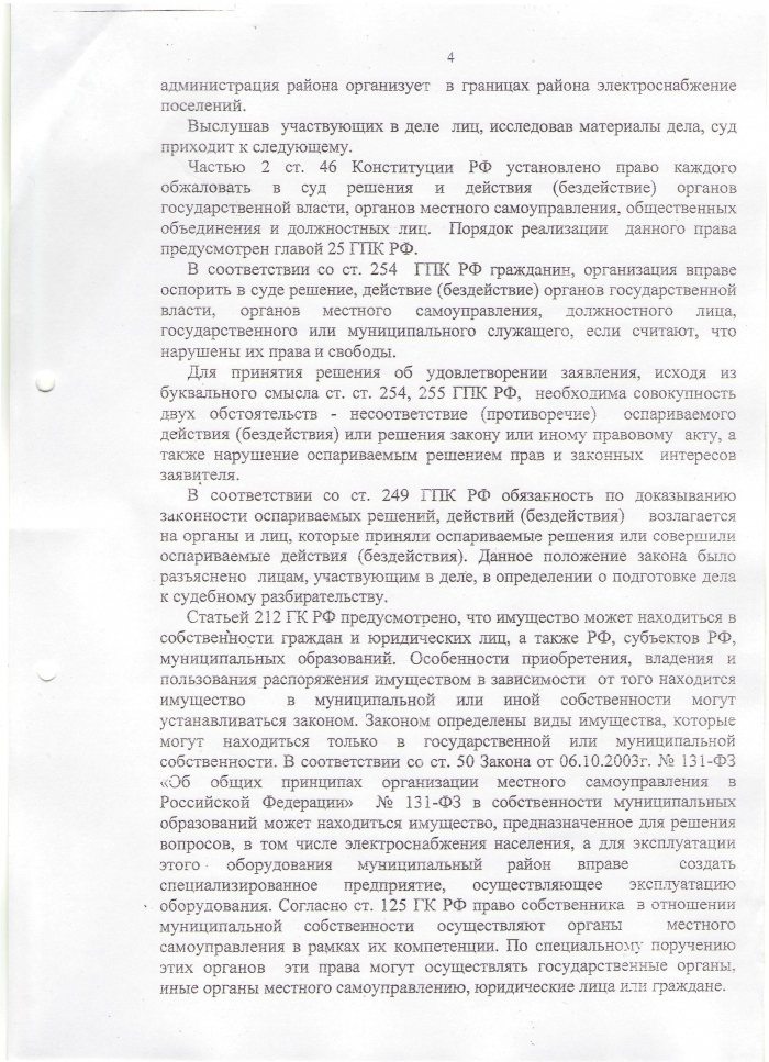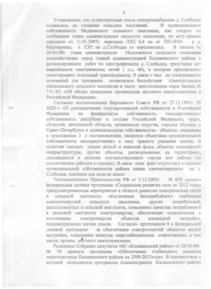 Суд пришел к выводу, что муниципальный орган власти Калининского района вообще не занимался электроснабжением деревни Слободка. Нарушен Федеральный закон № 131 «Об общих принципах организации местного самоуправления в Российской Федерации». Не учены Постановление Верховного Совета РФ от 27.12.1991 г. № 3020-1 о разграничении государственной собственности, Постановление Правительства РФ от 3.12.2002 г. № 858 о принятии федеральной целевой программы «Социальное развитие села до 2012 года», решение собрания депутатов МО «Калининский район» от 28.05.2009 г. № 76 о принятии программы «Обеспечение стабильного развития энергосистемы Калининского района на 2009–2013 года», а также п. 10 ст. 34 Устава муниципального образования Тверской области «Калининский район» об обязанности администрации Калининского района организовать в границах района электро- и газоснабжение населения.