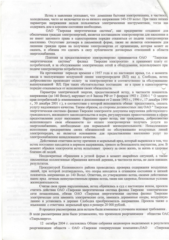 По-другому ведет себя ОАО «Тверская энергосбытовая компания». С сентября 2008 года с ее стороны не обнаружено никаких действий по исполнению решения суда. Компания многократно судилась с судебными приставами, оспаривая наложение на нее штрафа за неисполнение решение суда. Везде суды ей отказали. По словам представителя ОАО «ТЭК», они подали в суд на сетевую компанию МРСК Центра, которая должна обслуживать спорные электрические сети. Какие подвижки происходят в суде, непонятно. Да и потребителю как-то это неинтересно, увидеть бы действия ответчика по исполнению решения суда. А действий нет!