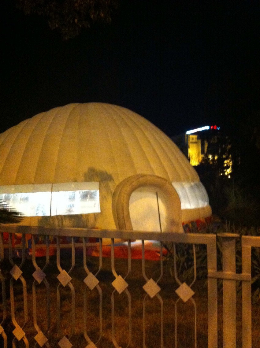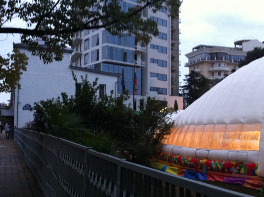 Внимание моё на Курортном проспекте привлёк вот этот, как бы его называть, чум. Строят его — а его именно строят, а не просто надувают — в садике, что относится к церкви (и вот тут могу путаться) то ли свидетелей иеговы, то евангелистов. Хотя, может быть, это одно и то же…
