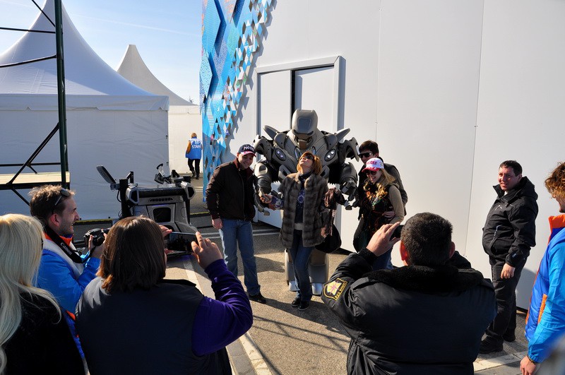 Дядьки за пультом управляют головой робота.