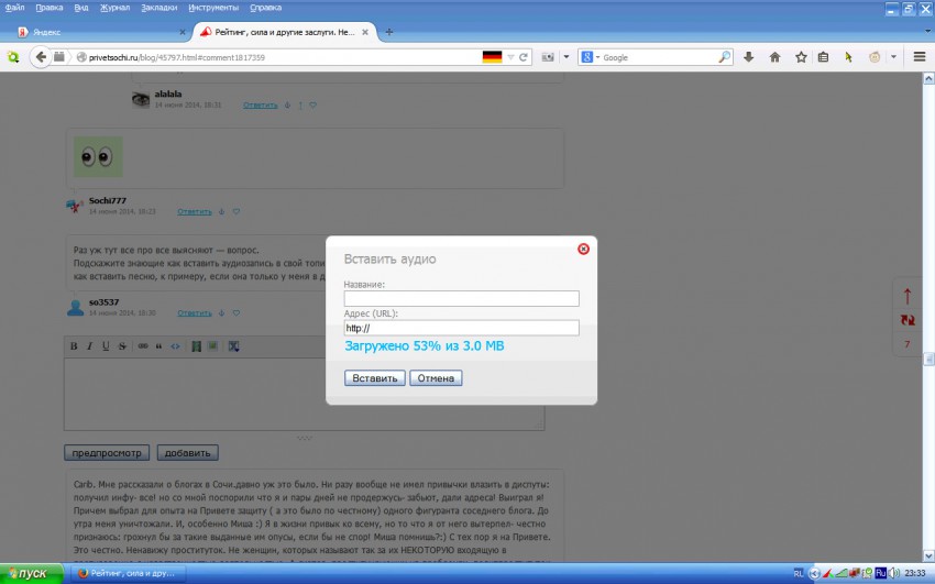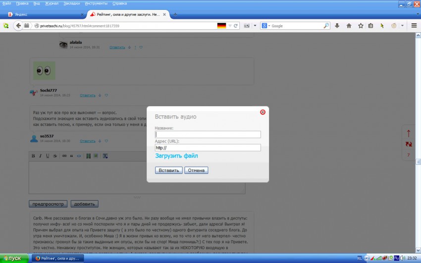 Подскажите знающие как вставить аудиозапись в свой топик? обязательно должна быть ссылка с Интернета? а как вставить песню, к примеру, если она только у меня в документах?