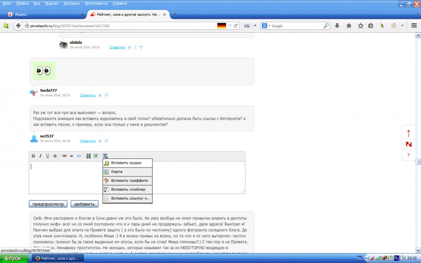 Итоговое резюме таково, что кто имеет более сильный рычаг, тот и рулит на сайте. Кидаются сворой на новичков, заклевывают насмерть. Смахивает на погоны, лампасы и каракулевую папаху в армии, остальным «упал-отжался!». Но Главнокомандующий должен быть всего один, Верховный хозяин сайта, другие могут быть кураторами и следить за порядком в блогах. А то на логотипе написано «Скажи свое слово в жизни города!», а попробуй… (Кстати, «слово О жизни города» было бы более по-русски).