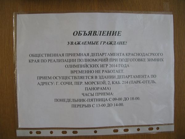 Никакого вакуума нет, не надо сочинять сказки. Вы собственник? Хотите выяснить попадает имущество или нет в зону строительства олимпийского объекта? Для вас все условия: Звоните по ЕДИНОМУ бесплатному телефону горячей линии, представляетесь, сообщаете необходимые для подготовки ответа данные, получаете официальный ответ. Точно так же вы можете прийти в приемную департамента и выяснить вопросы, входящие в компетенцию департамента. Если вопрос не входит в компетенцию, вам подскажут куда обратиться. Кроме этого вы можете ознакомиться с информацией, опубликованной на сайтах участников олимпийского проекта, ознакомиться с законами и олимпийскими программами, из которых вы узнаете кто и какими полномочиями обладает, кто что делает, кто что строит, где строит, сроки начала и окончания работ, финансирование и тд. Это все опубликовано. Если вам читать лень или нет возможности — звоните в горячую линию, пишите в интернет-приемные, приходите лично в общественные приемные. Если и этих возможностей нет, вас могут посетить компетентные сотрудники и предоставить информацию по существу.