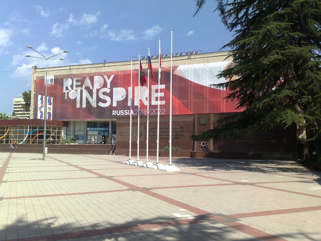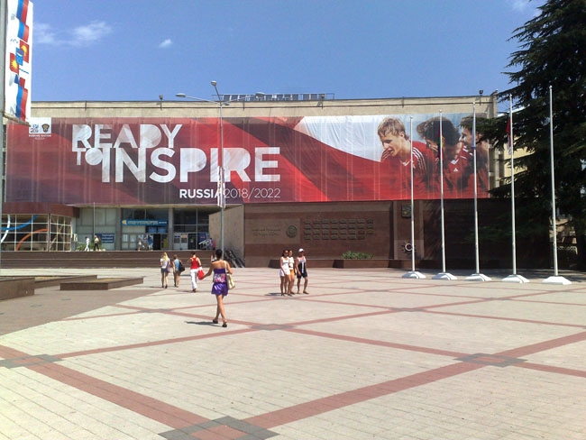 ЗЫ. На мой взгляд, этот баннер по своему цветовому решению лучше соответствует облику нынешней площади вообще и новому «Олимпинариуму» в частности, нежели прежний с двумя Кубанцами.