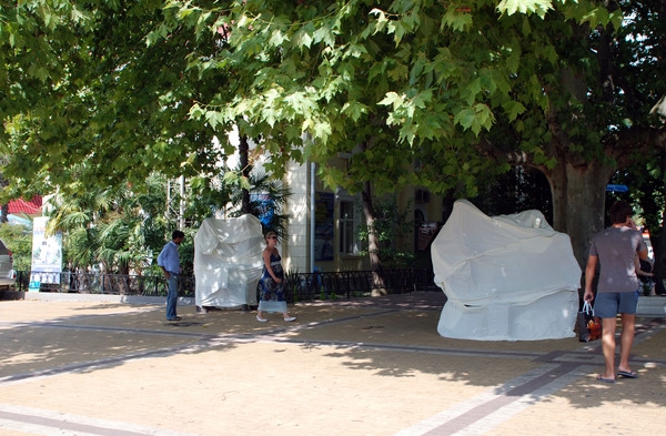 А за трогательной сценой прощания следят еще два героя популярного фильма контрабандисты Геша и Лелик, — «поэтическая» вольность скульпторов, но как было обойтись без этой пары.