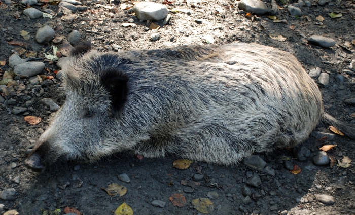 В соседнем просторном вольере с небольшим ручьем огромными серыми валунами лежит целое семейство кабанов. Дети отдельно, взрослые отдельно. И все совершенно неподвижны. А на клетке написано: «Осторожно, у наших животных брачный период». Это получается, что они ведут себя агрессивно, что ли? Каковы же они в спокойном состоянии, интересно?