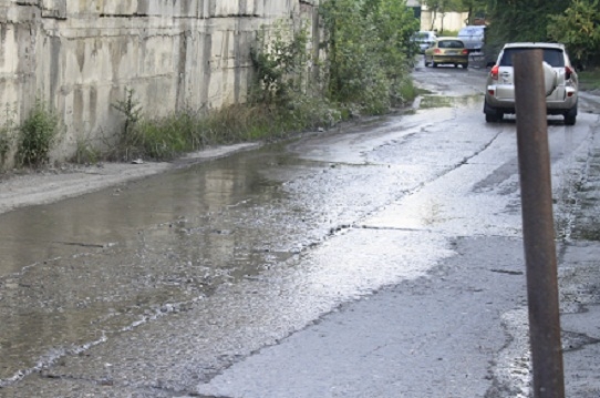 И это дырявое состояние улицы длится не один год.У экономных автовладельцев есть отличное место искупать машину нахаляву.Ну и что что канализация?!!! Зато отцы города обеспечили бесплатную автомойку.